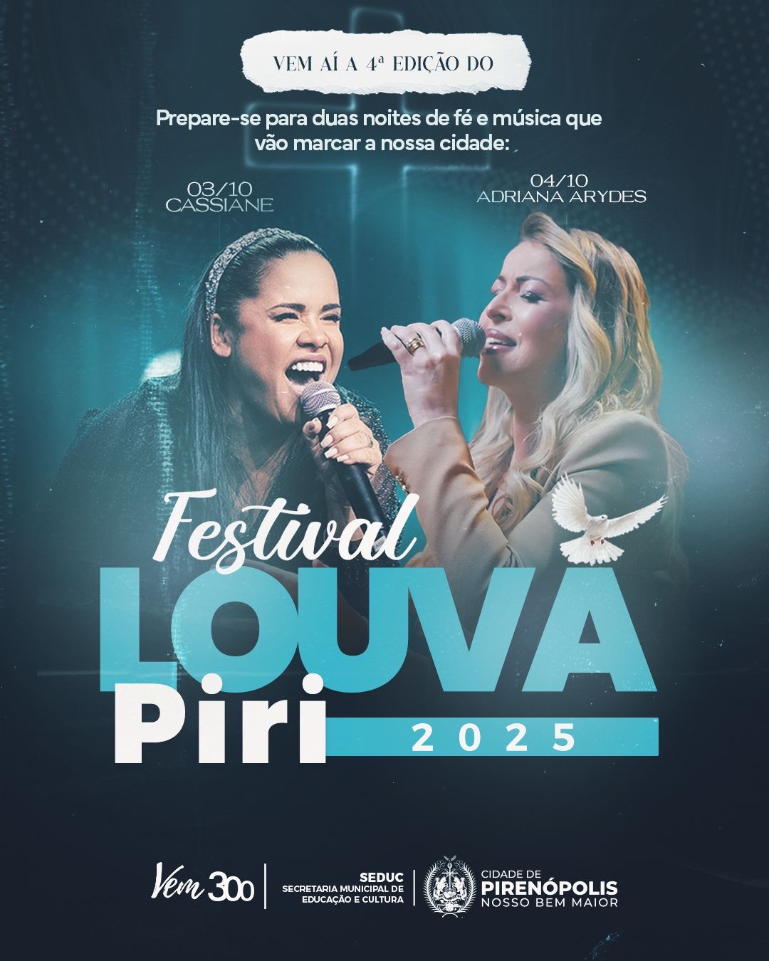 A cidade de Pirenópolis (GO) se prepara para uma grande celebração de fé e cultura. A 4ª edição do Louva Piri acontece nos dias 3 e 4 de outubro, reunindo milhares de fiéis na praça central para comemorar os 298 anos do município com shows de dois ícones da música cristã: Cassiane e Adriana Arydes. A entrada é gratuita.