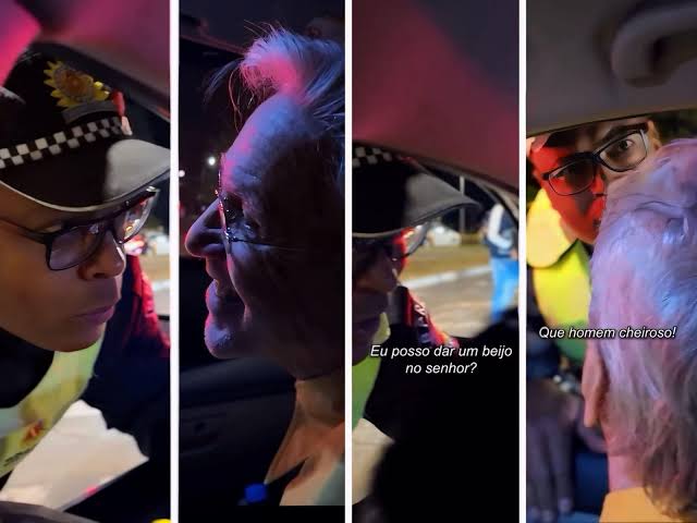 No vídeo, compartilhado por Caetano em suas redes sociais nesta segunda-feira (25), o policial militar aparece segurando um bafômetro enquanto se aproxima da janela do carro e faz um pedido inesperado: “Eu posso dar um beijo no senhor?”. O músico consente e, em seguida, recebe não apenas o beijo, mas também um abraço do agente, que ainda comenta: “Ah, que maravilha! Que homem cheiroso!”.