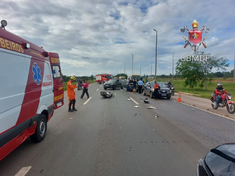 Uma colisão entre três carros e uma moto resultou em vítima transportada ao hospital na região de Santa Maria nesta segunda-feira (05). O Corpo de Bombeiros Militar do Distrito Federal (CBMDF) foi chamado para prestar socorro na cena.