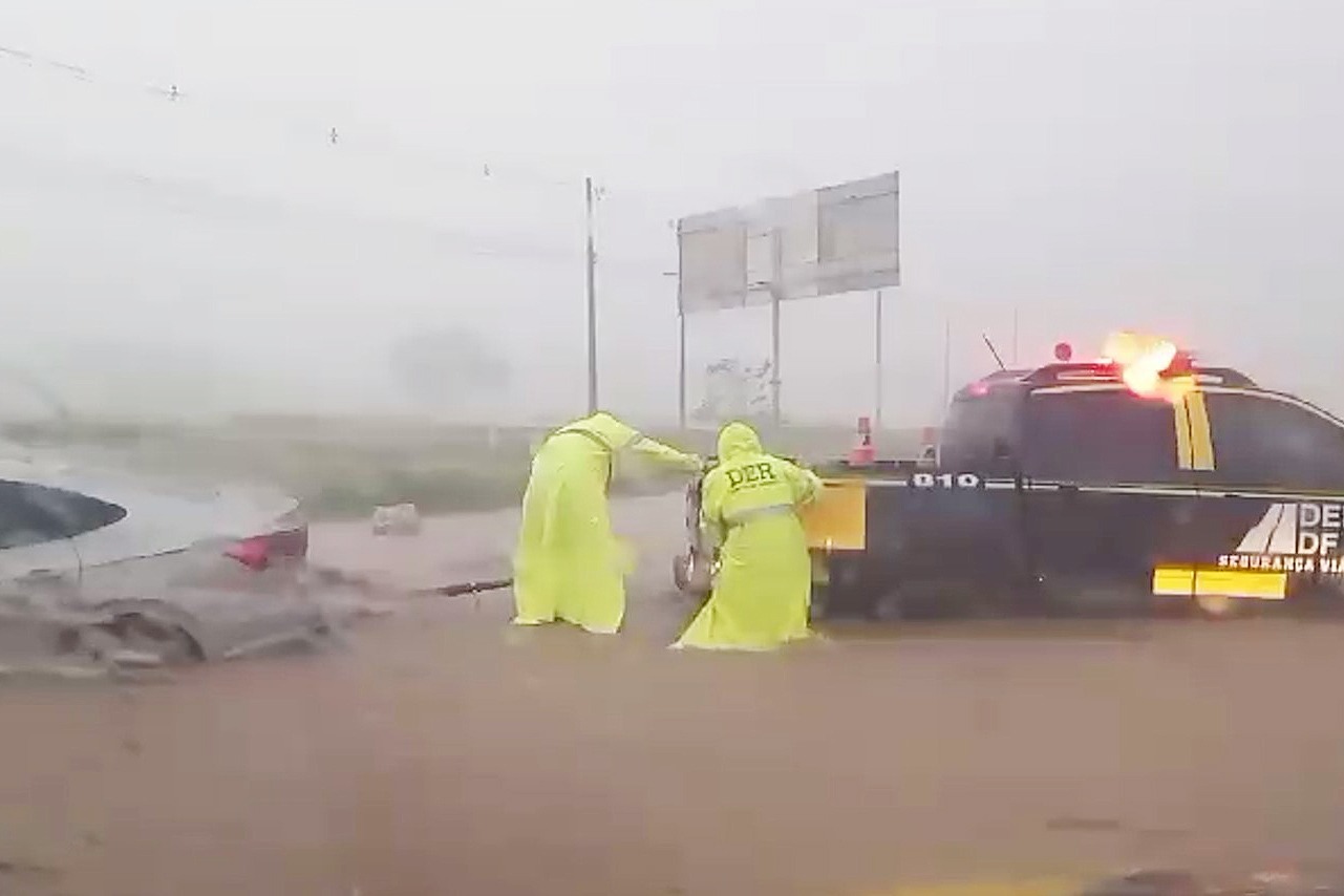 Durante as fortes chuvas que caíram na tarde de sexta-feira (23), uma equipe composta por quatro agentes de trânsito rodoviário do Departamento de Estradas Rodagem do Distrito Federal (DER-DF) salvou duas pessoas presas em um veículo durante um forte temporal na BR-070.