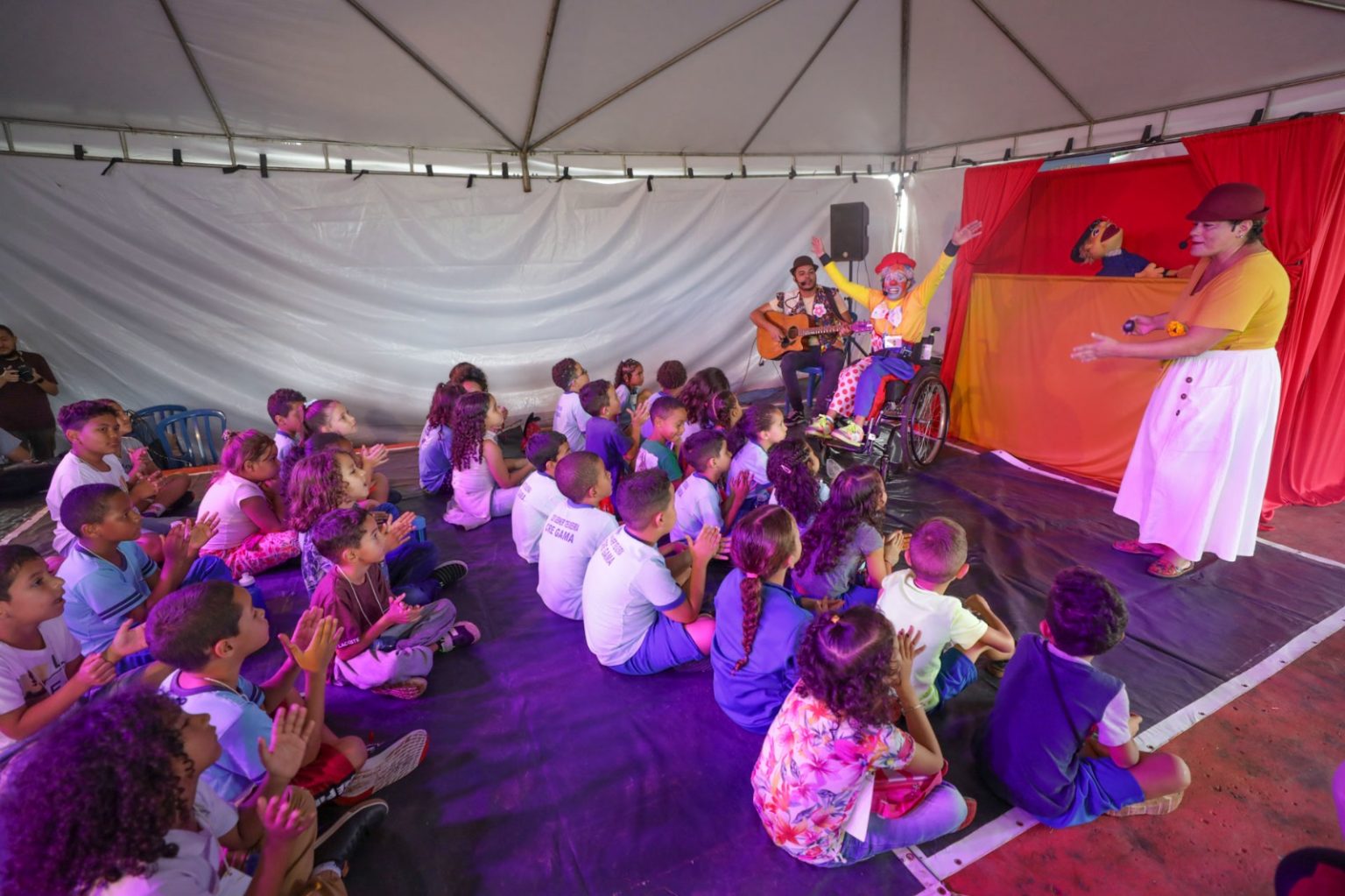 Nesta quinta-feira (14), pela manhã, foi a vez da turma do 1º e 2º ano de alunos da Escola Classe Gesner Teixeira, do Gama. O projeto oferece ônibus para levar estudantes gratuitamente para um passeio cultural no local onde serão realizadas as apresentações. As crianças cantaram, brincaram e interagiram com os artistas.