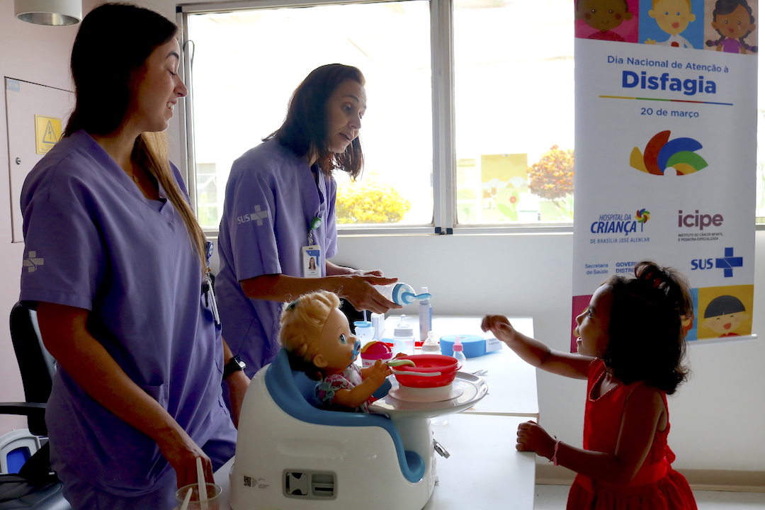 No Hospital da Criança de Brasília, o cuidado relacionado à disfagia está ligado ao acompanhamento de crianças que se alimentam via sonda. “Junto com a indicação da via mais segura, vamos tentando a reabilitação e liberando a alimentação por via oral. A alimentação pode ser exclusivamente por via oral; por via mista, no caso de pacientes que conseguem comer volumes mínimos pela boca e complementam via sonda; ou só para prazer – são pacientes para quem indicamos só o sabor e estímulo para qualidade de vida, mantendo a alimentação plena, de fato, pelas sondas”, relata a coordenadora Milena Fleury.
