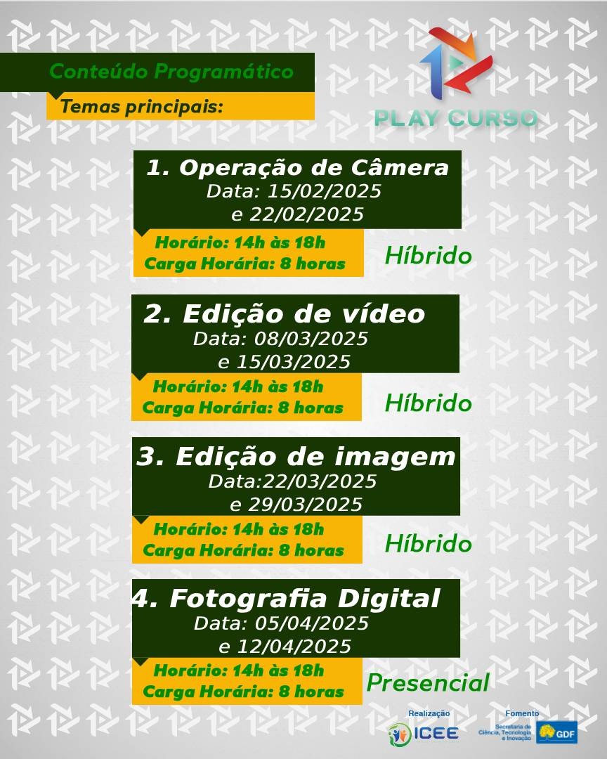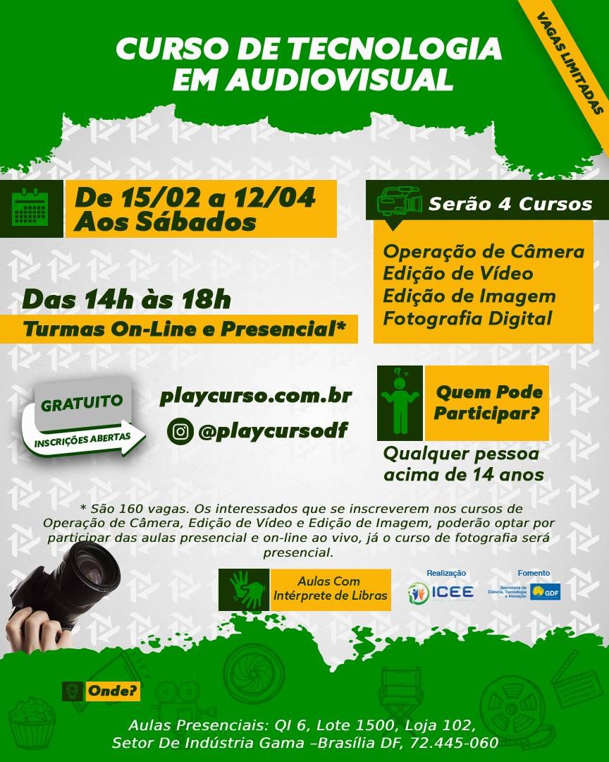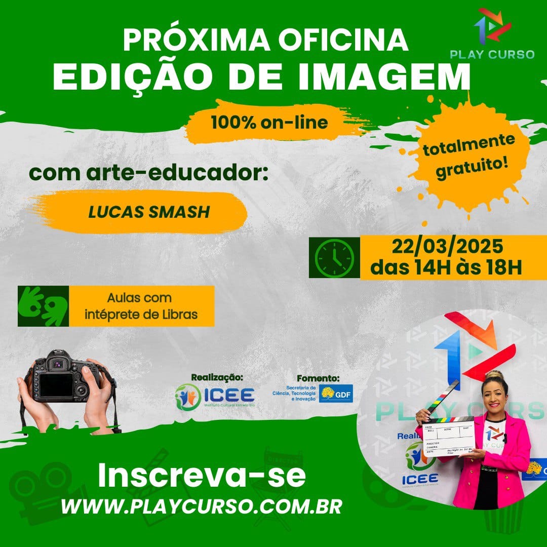O Projeto Play Cursos está com inscrições abertas para cursos gratuitos nas áreas de fotografia digital, operação de câmera, edição de vídeo e edição de imagem. A iniciativa, fruto de uma parceria entre a Secretaria de Ciência, Tecnologia e Inovação (Secti-DF) e o Instituto Cultural Estrela Ela, é destinada a jovens e adultos a partir de 14 anos, com o objetivo de promover a inclusão digital e capacitar novos profissionais para o mercado audiovisual.