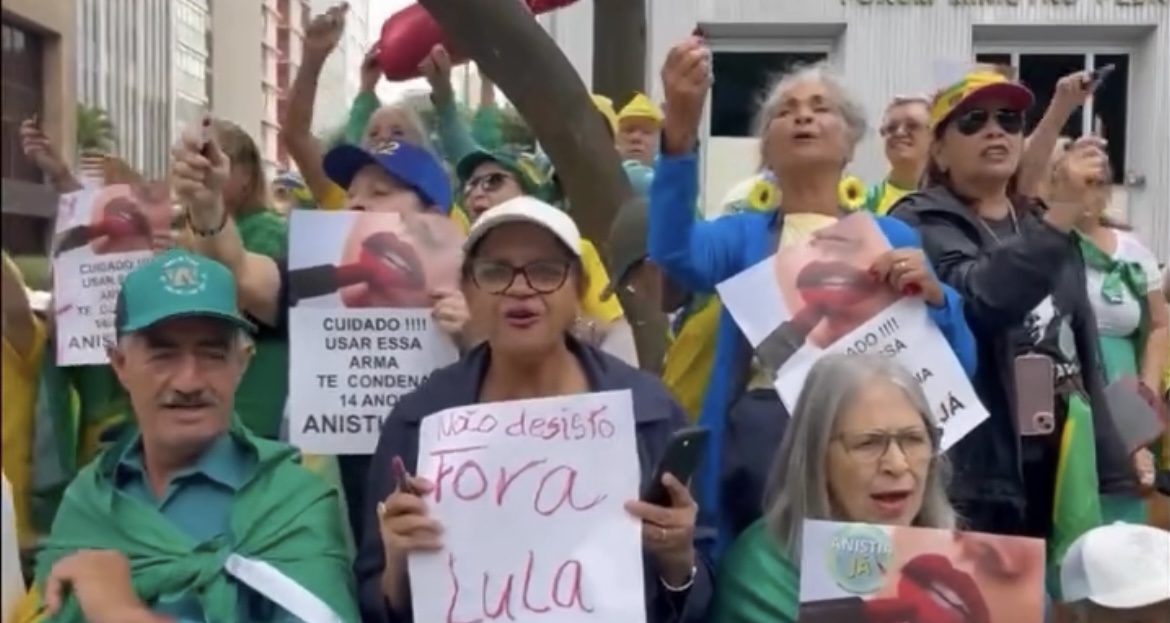 No local, a equipe do Metrópoles registrou um grupo de pessoas levantando batons como forma de protesto, em referência a Débora Rodrigues, mulher condenada a 14 anos de prisão após escrever “Perdeu, mané” na estátua da Justiça durante os acontecimentos de 8 de janeiro. “Cuidado!!! Usar essa arma te condena a 14 anos”, diz um dos cartazes exibidos pelos manifestantes, que também traz uma imagem de um batom como símbolo do protesto.