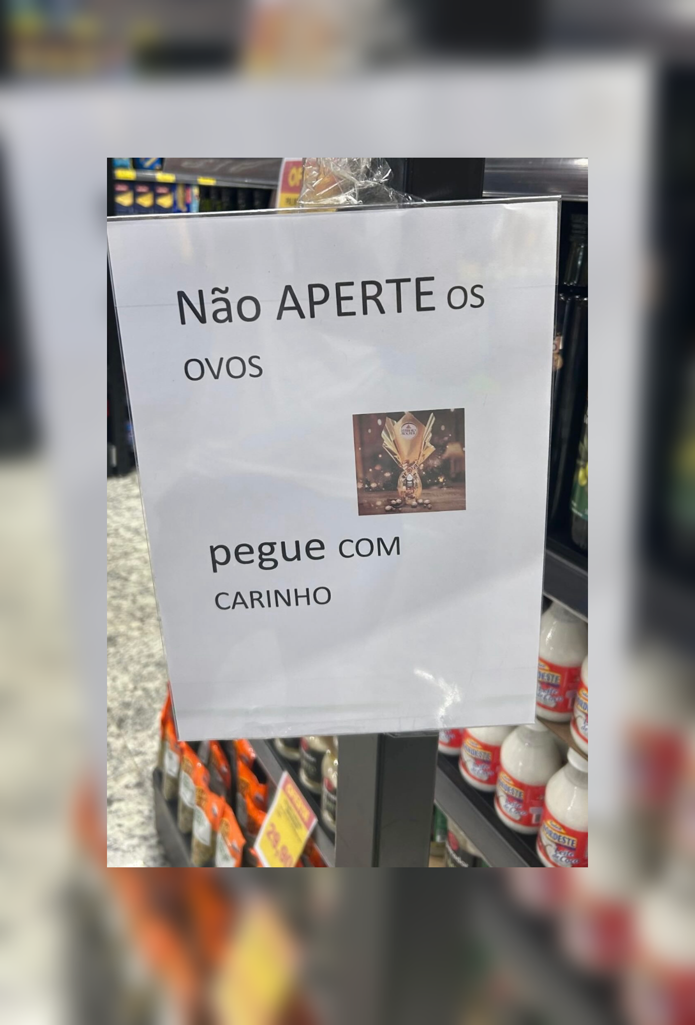 Colado bem na prateleira onde estavam expostos os ovos de Páscoa, o aviso direto e criativo diz: “Não aperte os ovos! Pegue com carinho.”