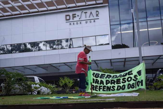 O momento da retirada foi registrado em vídeo. Nas imagens, a mulher aparece dobrando a faixa com os dizeres “liberdade aos presos reféns do 08/01”. A funcionária do hospital autorizou que outras bandeiras, como as do Brasil e de Israel, permanecessem no local.