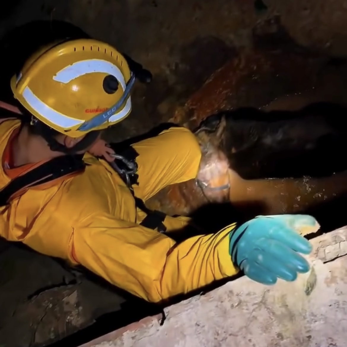 De acordo com a corporação, foi necessário usar uma bomba de esgotamento, além de um tripé e outros equipamentos específicos, para garantir que o animal fosse retirado do local em segurança.