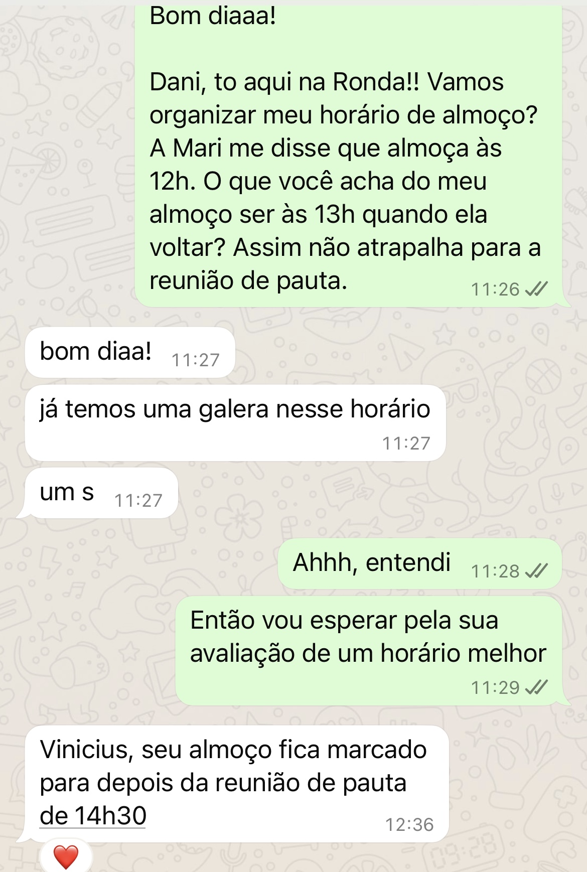“Na redação, a gente não podia nem comer uma fruta na mesa. Tinha que sair pra uma área externa, como se fosse algo errado se alimentar enquanto trabalha”, relata o jornalista. Segundo Vinícius, até os horários de alimentação eram rigidamente controlados. “Eu só podia almoçar depois das 14h30, quando acabava a reunião de pauta. Muitas vezes, ia almoçar às 15h da tarde porque ainda tinha que terminar uma certa demanda”, conta.