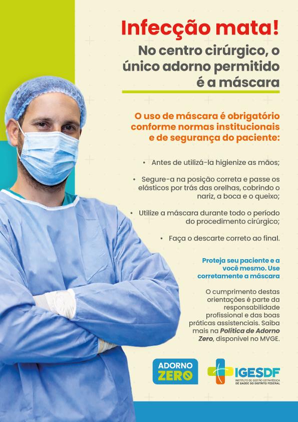 O Centro Cirúrgico do Hospital de Base do Distrito Federal (HBDF), unidade administrada pelo Instituto de Gestão Estratégica de Saúde do Distrito Federal (IgesDF), iniciou uma campanha de conscientização para reforçar a política do chamado “adorno zero”, que proíbe o uso de acessórios durante o trabalho. A regra, já vigente na unidade, tem um objetivo direto: reduzir o risco de infecções e fortalecer a segurança do paciente.